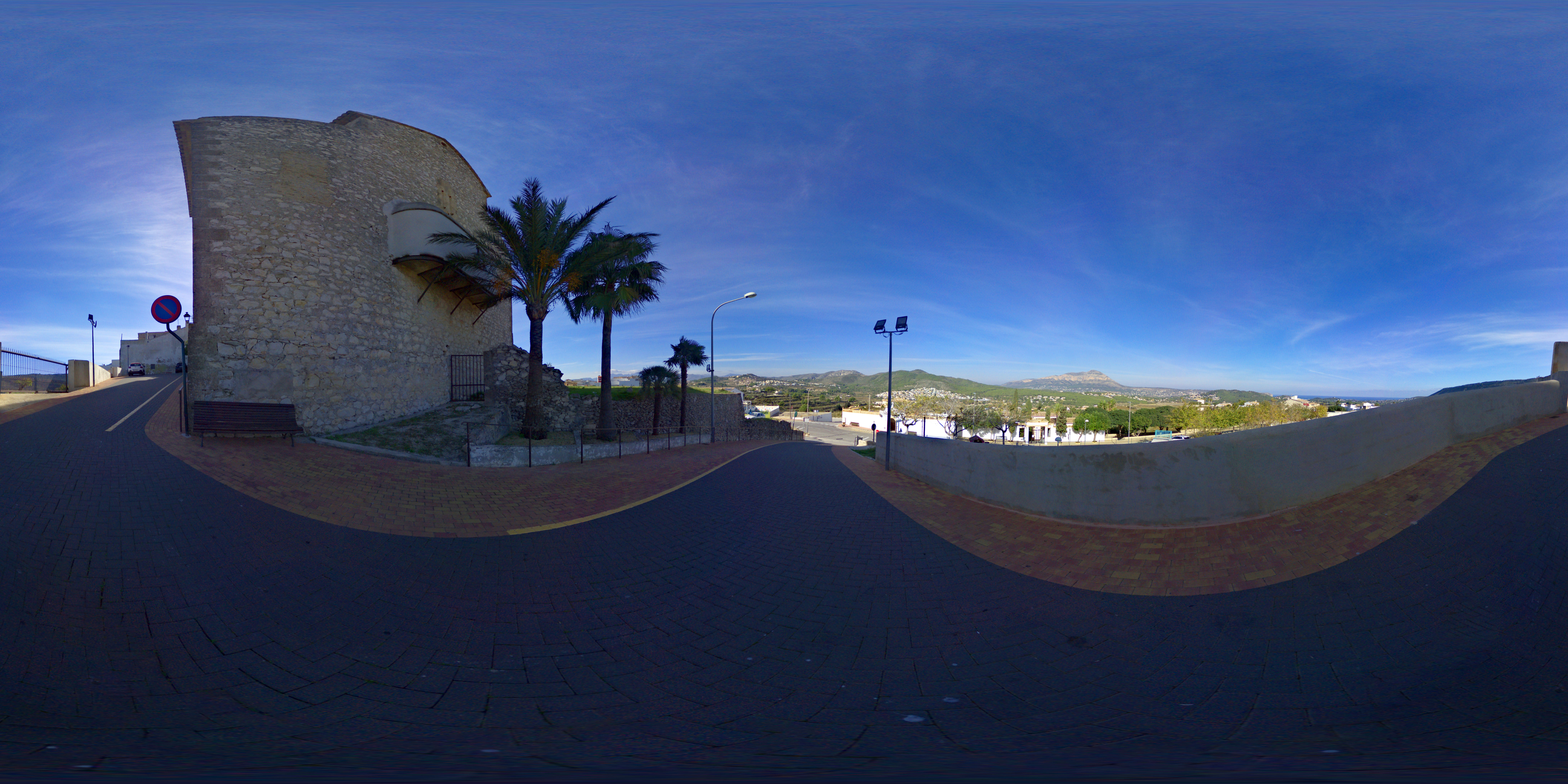 Mirador Iglesia. Desde uno de los miradores más hermosos de toda la comarca damos inicio a un recorrido histórico por el Poble Nou de Benitachell. Ante nosotros se encuentra la impresionante bahía de Javea, en la que podemos destacar el Cabo de San Antonio y el Mongo. Desde aquí apreciamos un paisaje agrario basado en el abancalamiento, en el que destaca la viña, el almendro y el olivo. El vino Moscatel, estandarte vinícola del Poble Nou de Benitachell, tiene como uno de los proyectos más ambiciosos el biomoscatel, con la producción ecológica de uva moscatel. Otro de los iconos comarcales de la Marina Alta que desde aquí observamos son los riuraus, construcciones relacionadas con la elaboración de la pasa, donde se guarecen los ganizos de la pasa y se dejan secar. Esta visión panorámica de la bahía favorecía la vigilancia y defensa de los campos del Poble Nou de Benitachell frente a los contrabandistas que antiguamente frecuentaban la comarca. Justo detrás de nosotros encontramos el Portalet y la parte trasera de las casas, que hacía las veces de muralla que protegía la población.